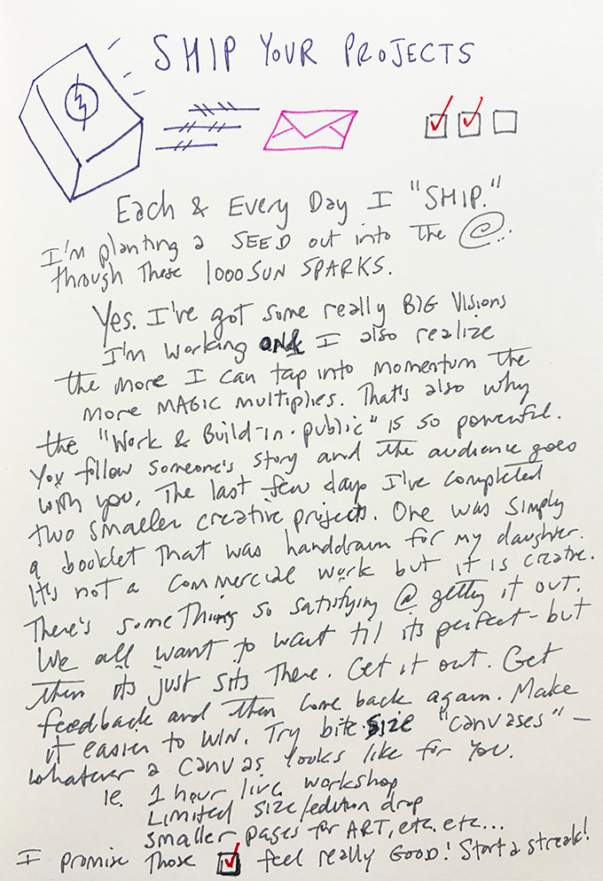 Your half-finished ideas want to get out Each and every day, I “ship.” Like this… It’s easy to wait for perfect timing or flawless execution.