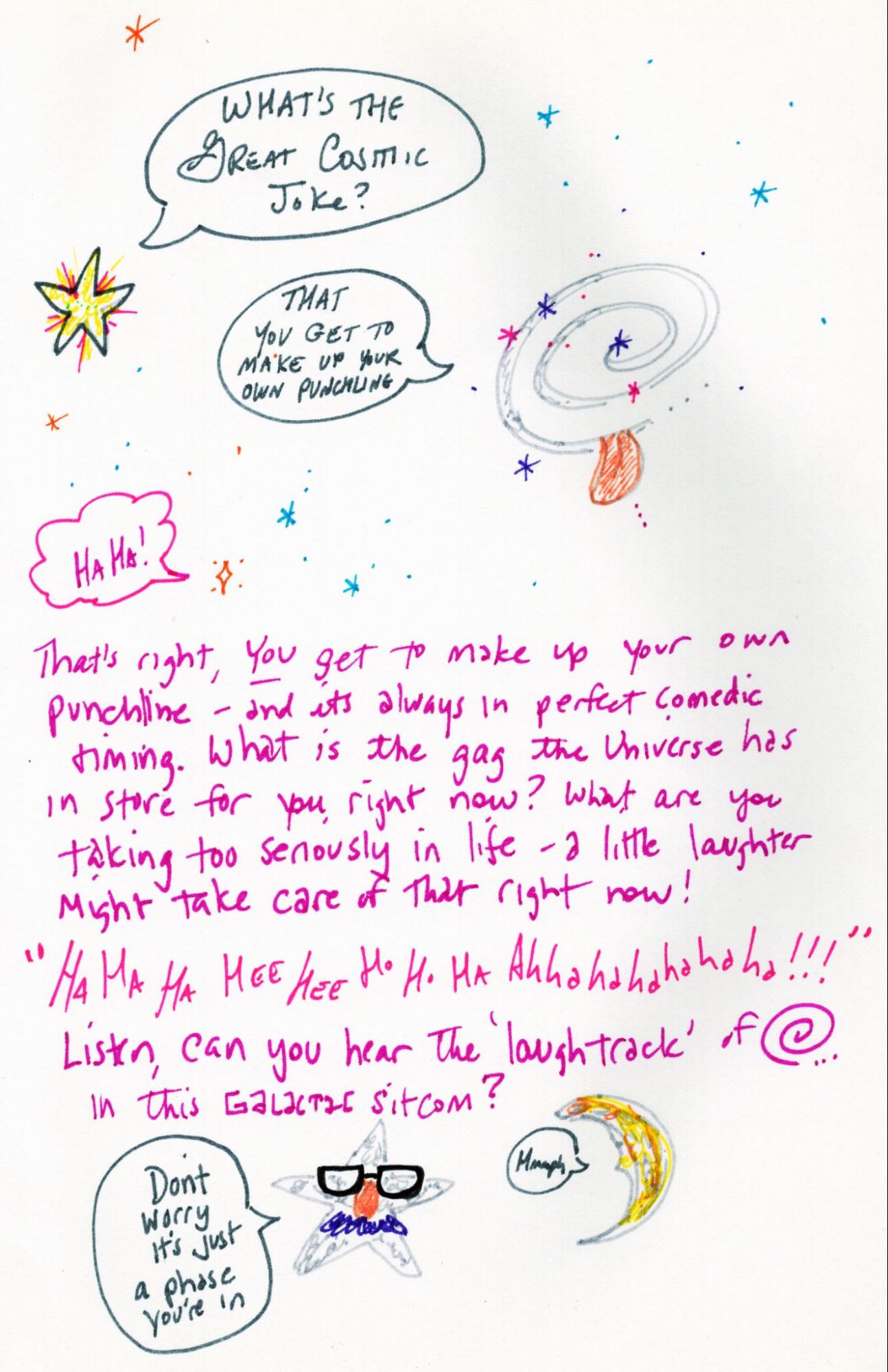 The punchline? You get to write it… There’s a galactic giggle echoing through the cosmos…You hear it? It starts with a whisper, wondering:“What’s the Great